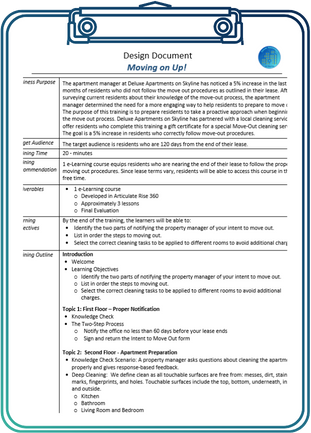 Training Purpose: After surveying current residents about their knowledge of the move-out process, the apartment manager of Deluxe Apartments on Skyline determined the need for a more engaging way to help residents prepare to move out. The purpose of this training is to guide residents in taking a more proactive approach when beginning the moving out process.